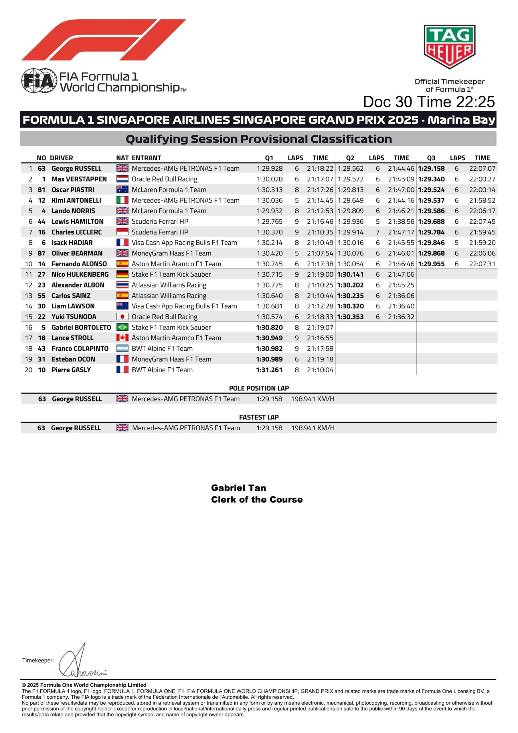 Η Mercedes εμφάνισε αξιοπρόσεκτη βελτίωση στα μονοθέσια της σήμερα, και ο George Russell κατέκτησε άνετα μια pole position στις κατατακτήριες δοκιμές του GP Σιγκαπούρης, για την οποία φαβορί έμοιαζαν Verstappen και McLaren. Μπροστά ο Piastri από τον Norris, μακριά οι Ferrari